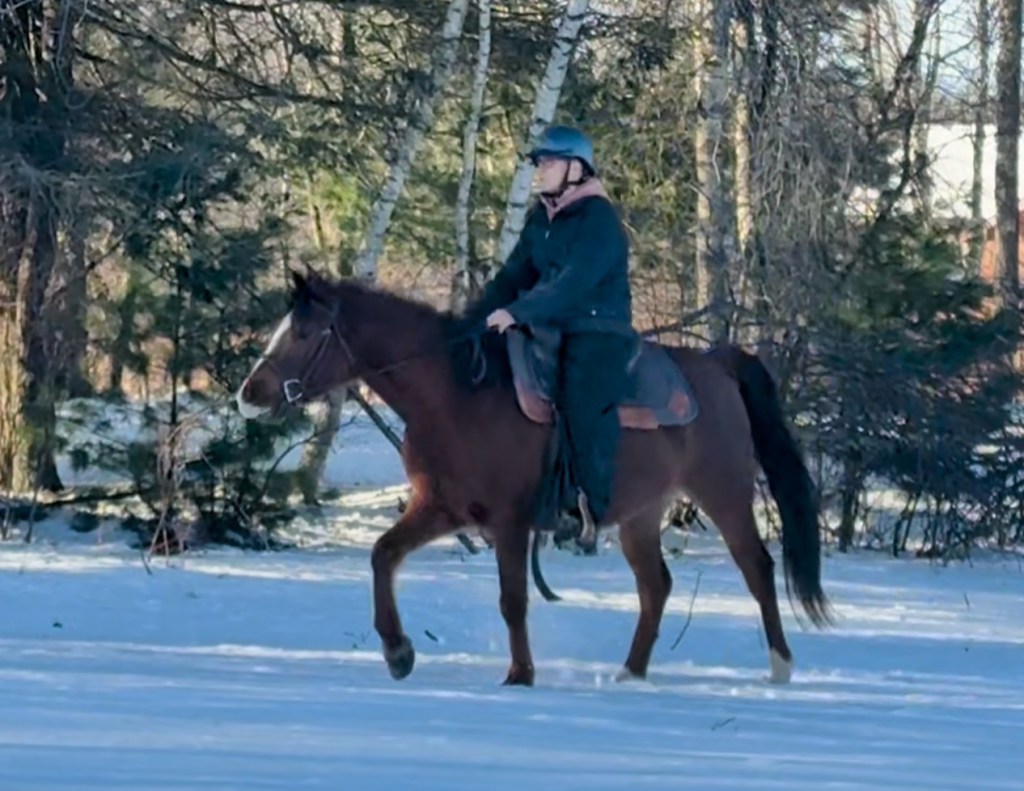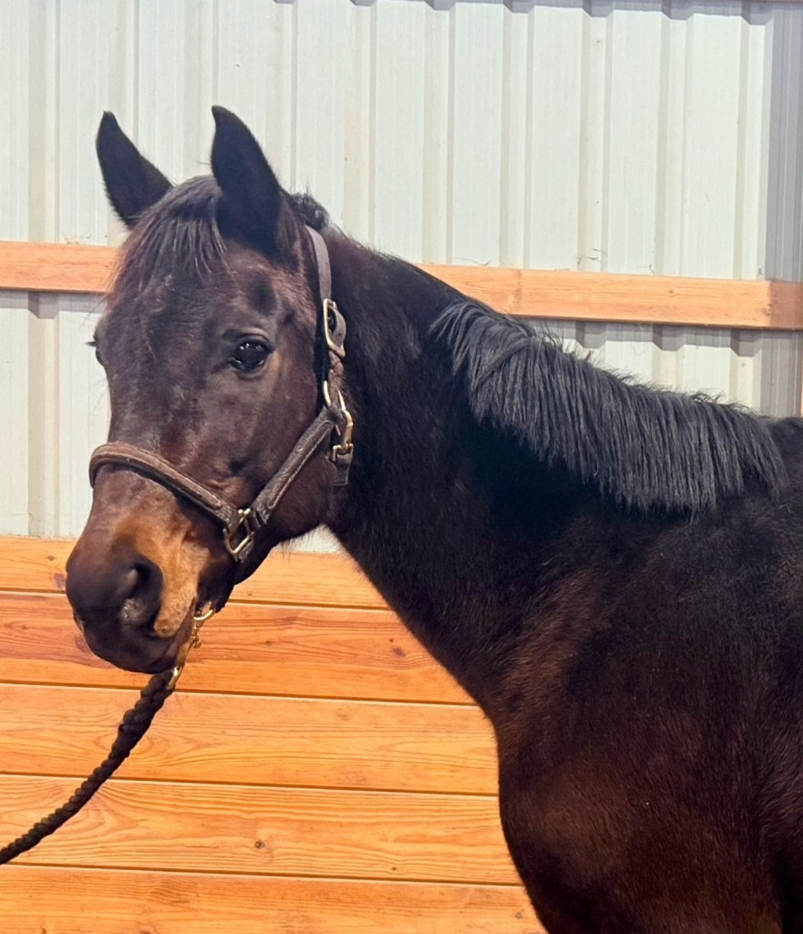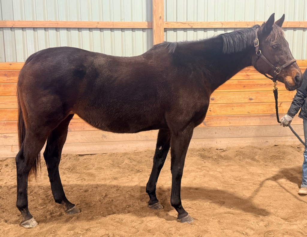 Lesson horse deluxe! Pixie will walk, trot, canter both leads, and jumps. She has been used for walk/trot through intermediate lessons English lessons in the past and has also done some lower level dressage lessons. Can be ridden under western tack too. She sat for the beginning part of the winter (owner didn’t have an indoor) but is now getting back into a groove and ready to add to your program. Sensible to ride, likes a soft hand like most TB, but otherwise easy to get along with. Pixie is not marish, she is pleasant to work around, groom, and tack. very sweet mare. Stands at the mounting block as long as you have a cookie for her. Turns out with a mixed herd and is easy to catch. She is currently barefoot and sound, but is used to wearing front shoes when in more regular work. Take this mare home and get her fit and she will be great for a lesson program or anyone that wants a kind quiet big horse to enjoy.
