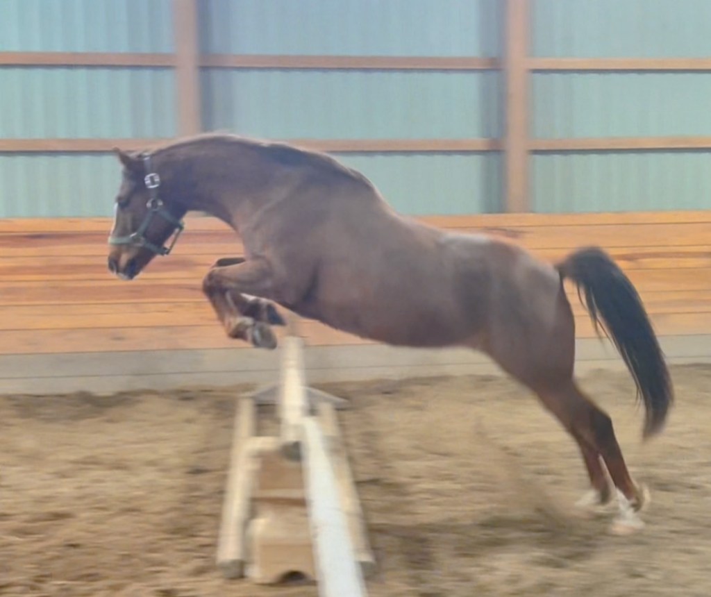 This is a talented young mare has the style and movement to turn heads in the hunter ring. She measures just over pony size, but would be an ideal mount for a junior or petite adult. She has been in our barn for a few months, growing and learning, and just gets nicer every day. For a young pony, she has a fabulous brain and is happy to ride in the arena or out down the trail. Walks, trots, canters both leads and is sensible around other horses in the arena. Learning to carry her herd nicely, has been lightly started over fences and is incredibly willing. Jumps in nice form and is very brave. Korbel also enjoys hacking out around the farm, goes on her own or with other horses, crosses water, and is traffic safe. She is very well started for a young horse, and makes progress every ride. Korbel currently turns out with a mixed herd and gets along well. She currently wears front shoes and is easy for the farrier. Easy to catch, groom, tack, bathe, loads and hauls well. You will never know that she is a mare, she is extremely even tempered. A sweet young lady to work around, pleasure to have in the barn, Korbel has a bright future ahead of her no matter what direction you take her.