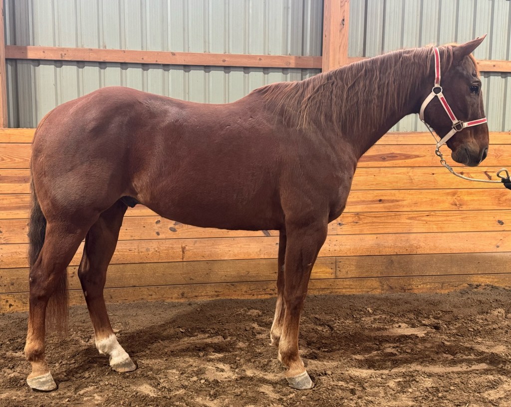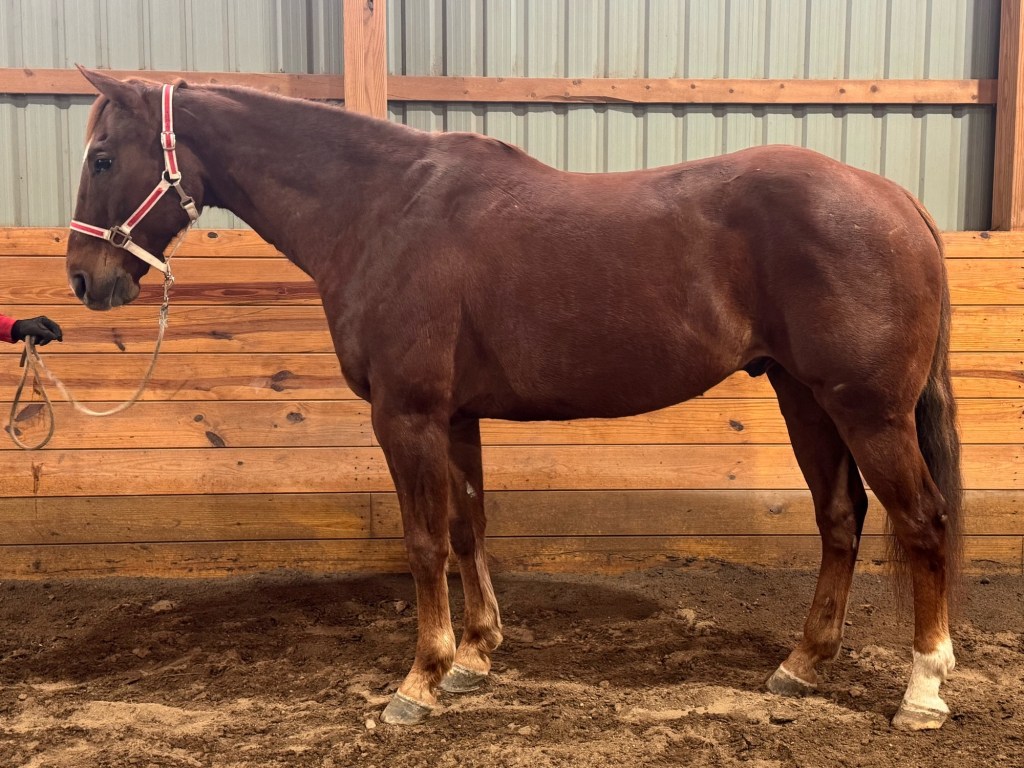 If you want a fast horse, she is not the one for you. If you’re looking for a slow and steady type so that your husband, boyfriend, guest, or grandma can follow you down the trail, then Tilly is your girl! This would be the ideal horse for a weekend warrior or someone who just wants a safe extra to toss a friend on and hit the trails once in a while. She is not 100% sound and seems to go best with some Equioxx, but she is that good safe steady eddy kind of horse in a nice stout size, which is a hard deal to find. Tilly has ridden around the arena some, and we have seen her canter (once!) but she much prefers life out on the trails. She is LAZY and would love a rider that just wants to meander and enjoy the scenery. Rides well in a group and seems brave enough to head out on her own too. Tilly currently turns out with a mixed herd and gets along well. She is polite to work around, not marish, easy to groom and tack. She currently is wearing front shoes. This mare has a lot to offer to someone who doesn’t mind doing a little maintenance to have a steady mount.